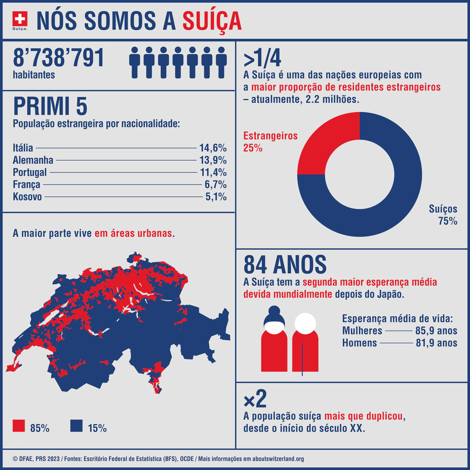 - A população da Suíça está em grande crescimento tendo aumentado 2,7 vezes entre 1900 e 2022.