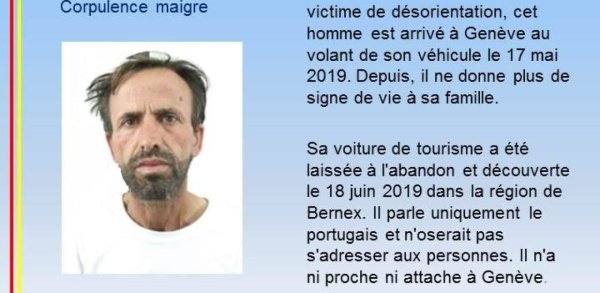 A polícia do cantão de Genebra publicaram sexta-feira à tarde um comunicado a procurar o Sr. José Joaquim. Este nacional português tem 52 anos e chegou de carro no dia 17 de Maio. Desde então, ele não deu nenhum sinal de vida, seu veículo foi encontrado abandonado na região de Bernex. Este último foi descoberto em 18 de maio.